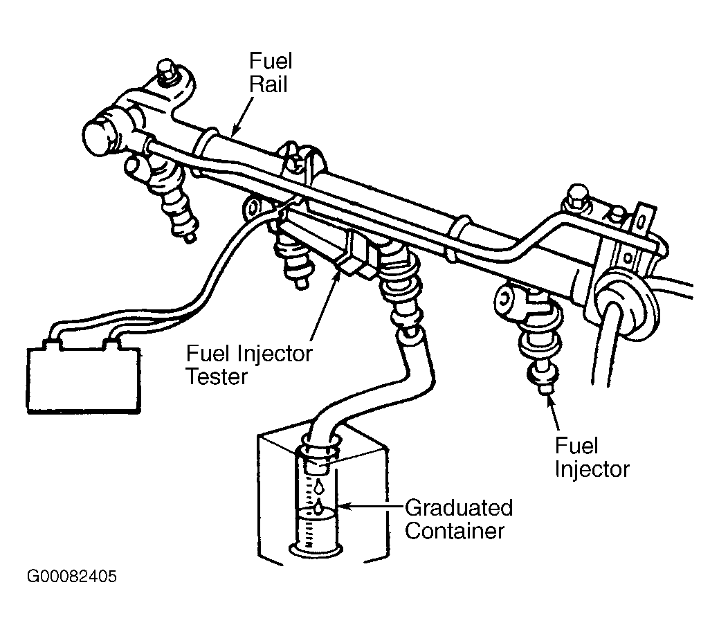 1. Remove fuel injectors together with fuel rail. See FUEL DELIVERY PIPE & FUEL INJECTORS under FUEL SYSTEM in REMOVAL & INSTALLATION article. Secure fuel injectors to fuel rail. See Figure. Place end of injector to be tested in graduated cylinder.