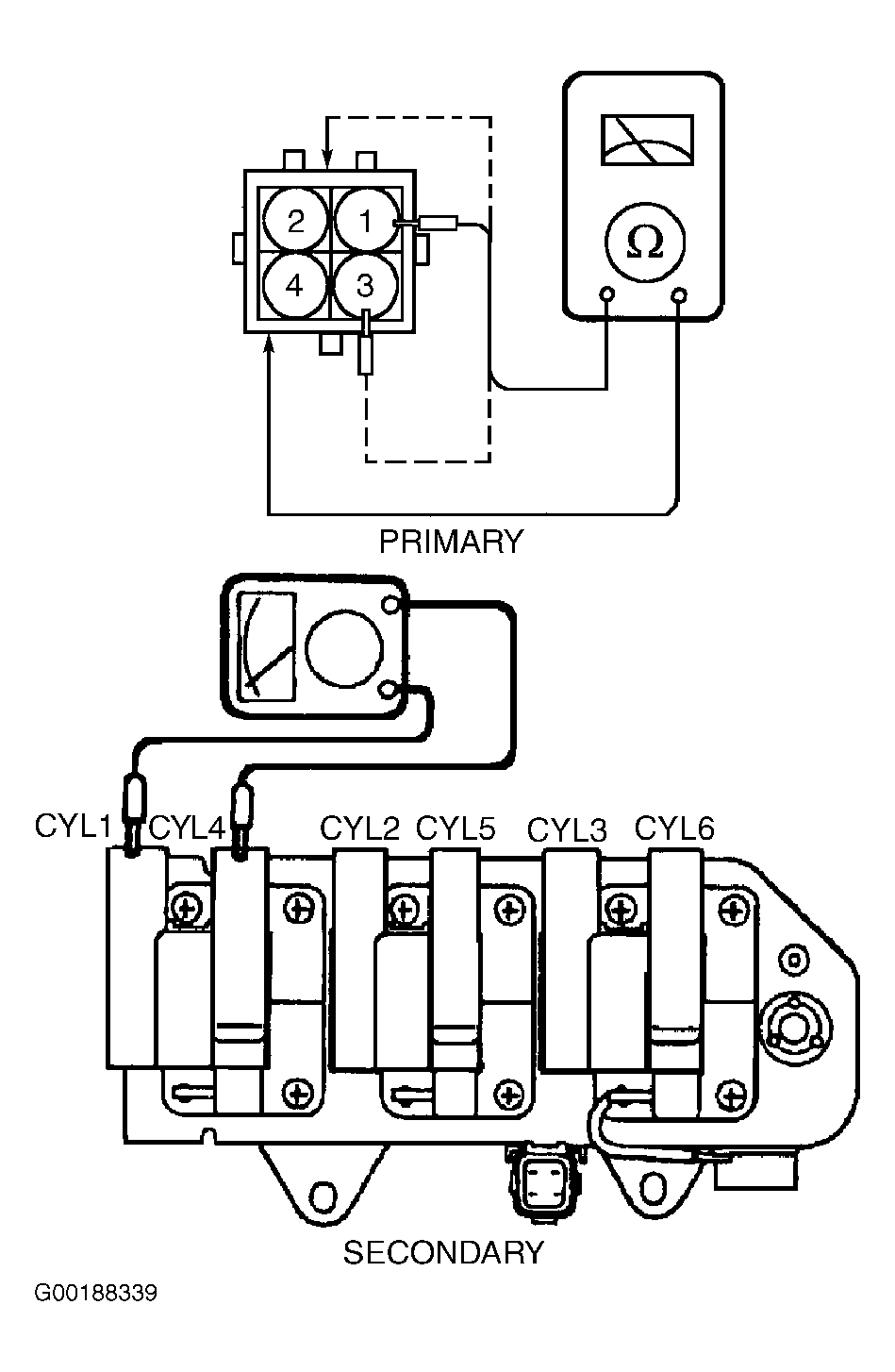 Measure resistance between connector terminals No. 4 and 1, 4 and 2 and 4 and 3. See Fig 1. For ignition coil resistance, see IGNITION COIL RESISTANCE table. If resistance is not as specified, replace coil pack.