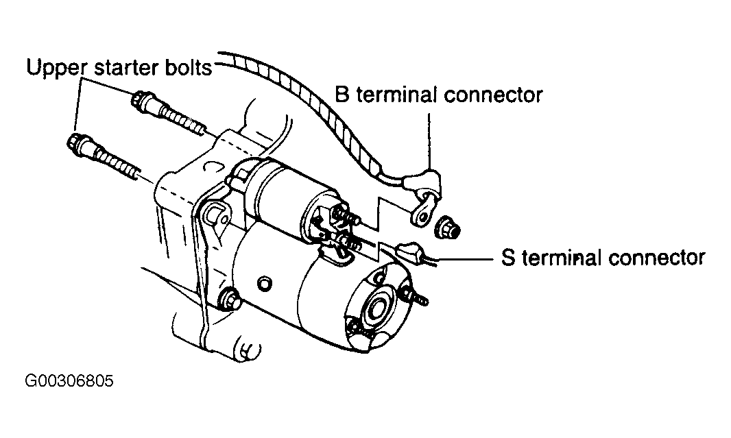 Using ohmmeter, check for continuity between starter solenoid "S" and "M" terminals. Figure . Replace solenoid if there is no continuity. Check for continuity between "S" terminal and solenoid body. If continuity does not exist, replace solenoid. Check for continuity between "M" and "B" terminals. If continuity exists, replace solenoid.