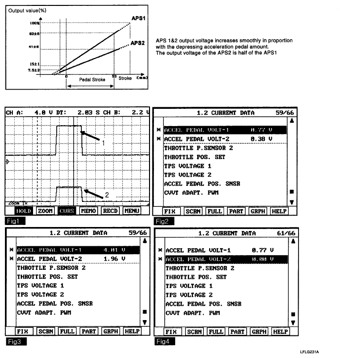 | Normal value with ignition "ON" & engine "OFF" | APS 1 & 2 output voltage increases smoothly in proportion with the depressing acceleration pedal amount. The output voltage of the APS2 is half of the APS1 | Fig. 1 | ||
