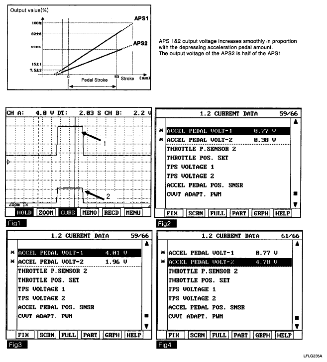 | Normal value with ignition "ON" & engine "OFF" | APS 1 & 2 output voltage increases smoothly in proportion with the depressing acceleration pedal amount. The output voltage of the APS2 is half of the APS1 | Fig. 1 | ||