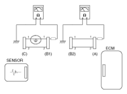 - Disconnect connector (B), and measure for resistance between connector (C) and (B1) and between (B2) and (A) as shown in Fig 3.