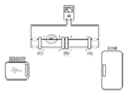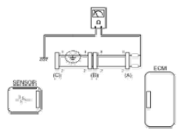 - With each connector still connected, measure the voltage between the chassis ground and terminal 1 of each connectors (A), (B) and (C) as shown in [Fig 4].