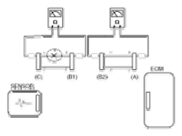 - Disconnect connector (B), and measure for resistance between connector (C) and (B1) and between (B2) and (A) as shown in [Fig 3].