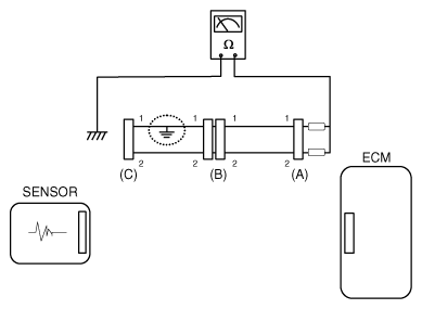 - Disconnect connectors (A), (C) and measure for resistance between connector (A) and Chassis Ground as shown in [Fig 2].