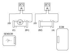 - Disconnect connector (B), and measure the resistance between connector (C) and (B1) and between (B2) and (A) as shown in [Fig 3].