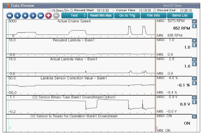Home >> Kia >> 2017 >> Cadenza Technology >> Repair and Diagnosis (Single Page) >> Engine Performance >> System >> Engine Control System Diagnosis (2 Of 6) >> DTC P0139-00: O2 Sensor Circuit Slow Response (Bank 1/Sensor 2) >> DTC Inspection >> Monitor KDS/GDS Data
