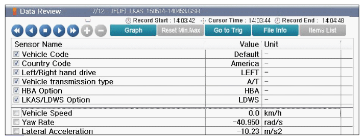 4. Monitor "Country Code", "Left/Right hand drive", "Vehicle transmission type", "HBA Option" and "LDWS/LDWS Option parameters" in "Current Data" with KDS/GDS.