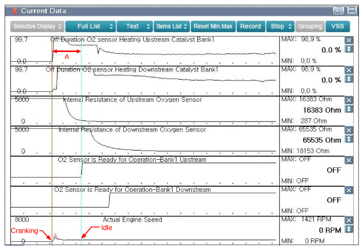 Fig 1: Scantool Display - Upstream O2 Sensor Reaches Operative Temperature Approximately Within 8 SEC After CrankingCourtesy of KIA MOTORS AMERICA, INC.