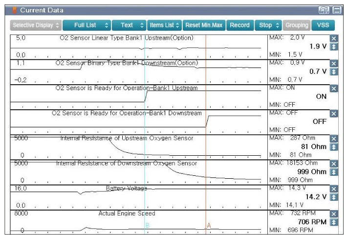 Fig 1: Scantool Display - Upstream O2 Sensor And Downstream O2 Sensor Voltage Current Data When O2 Sensor Ready For Operation At Idle