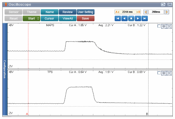 - Ignition "ON" & Engine "ON".Fig 1: Scantool Display - Upstream O2 Sensor And Downstream O2 Sensor Signal Waveform (Warm-Up Condition)