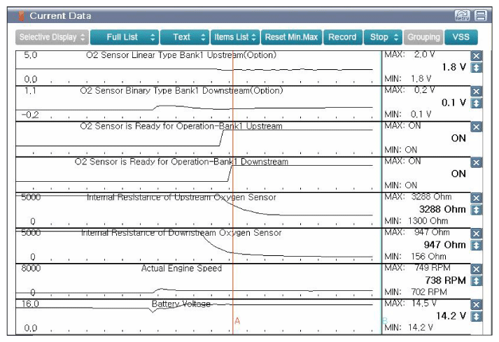Fig 1: Scantool Display - Upstream O2 Sensor And Downstream O2 Sensor Voltage Current Data When O2 Sensor Ready For Operation At Idle