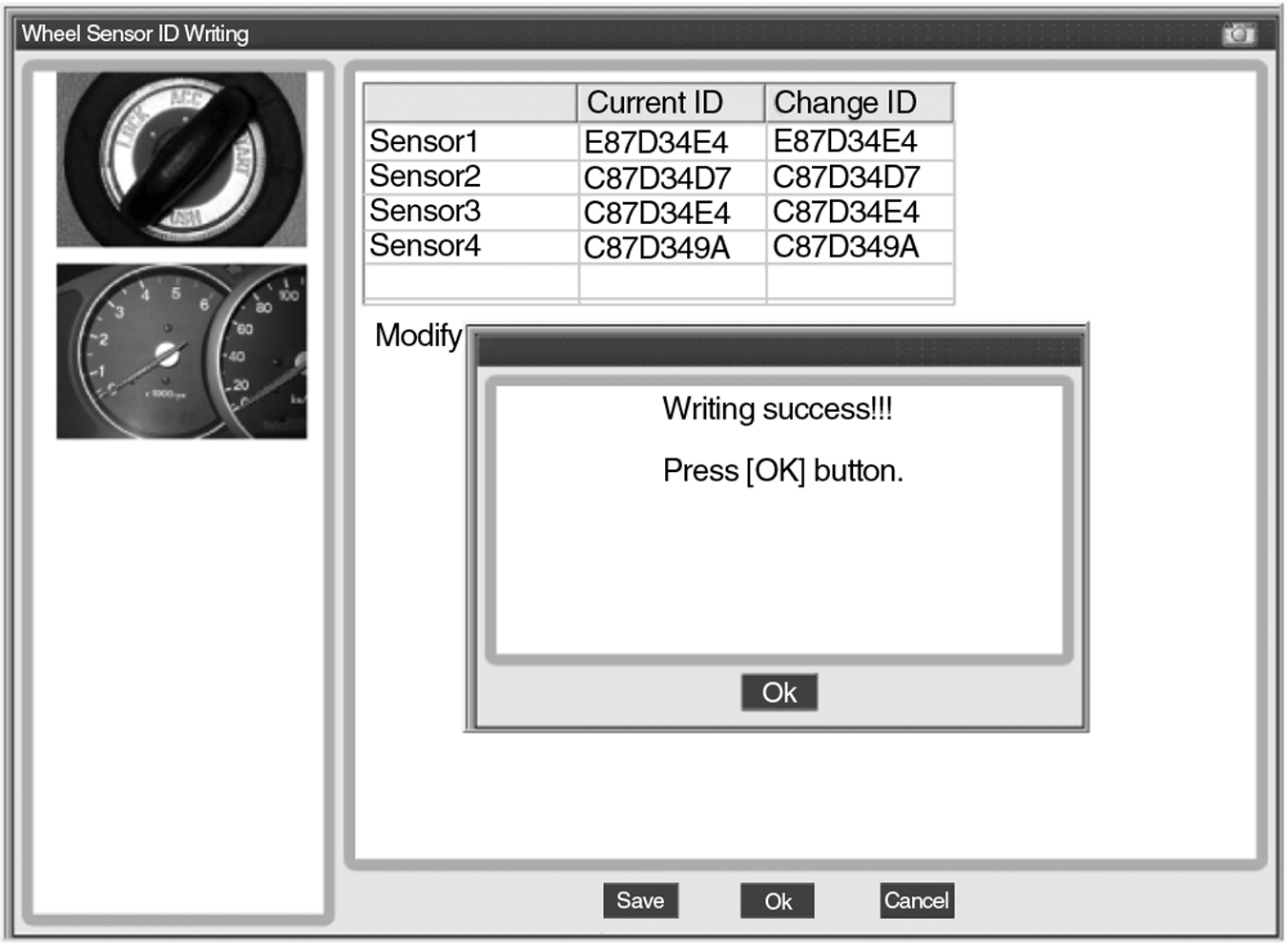 - Modify any sensor ID and press the [OK] button.NOTE: The TPMS receiver will complete the learn procedure of the new sensor after vehicle is driven up to 20 minutes at speeds over 15 mph (24 km/h).NOTE: For the system to correctly monitor the tires for under-inflation, there should be a total of exactly 4 sensors, one on each of the four road wheel positions. There should be no other sensors in the vehicle since this could cause the system to monitor the wrong sensors or fail to lean a new sensor.