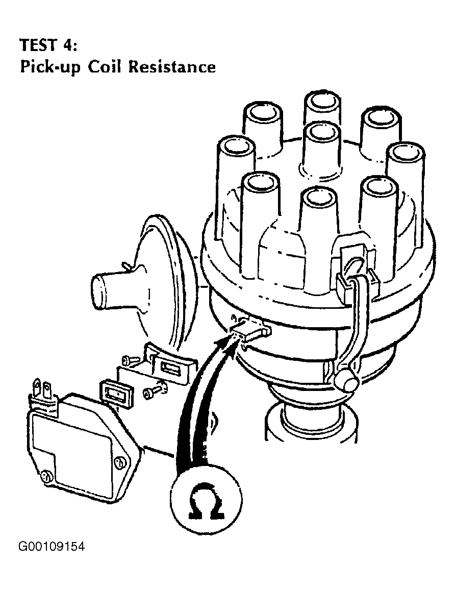 Remove the amplifier. See Fig 1 . Connect the ohmmeter leads to the two pick-up terminals in the body of the distributor. The ohmmeter should register 2000-5000 ohms if pick-up is satisfactory. If ohmmeter reading is correct, check all connections between pick-up and amplifier. If satisfactory, fit new amplifier. If the engine still does not start carry out TEST 5  . Change the pick-up if ohmmeter reading is incorrect. If the engine still does not start proceed to TEST 5  .