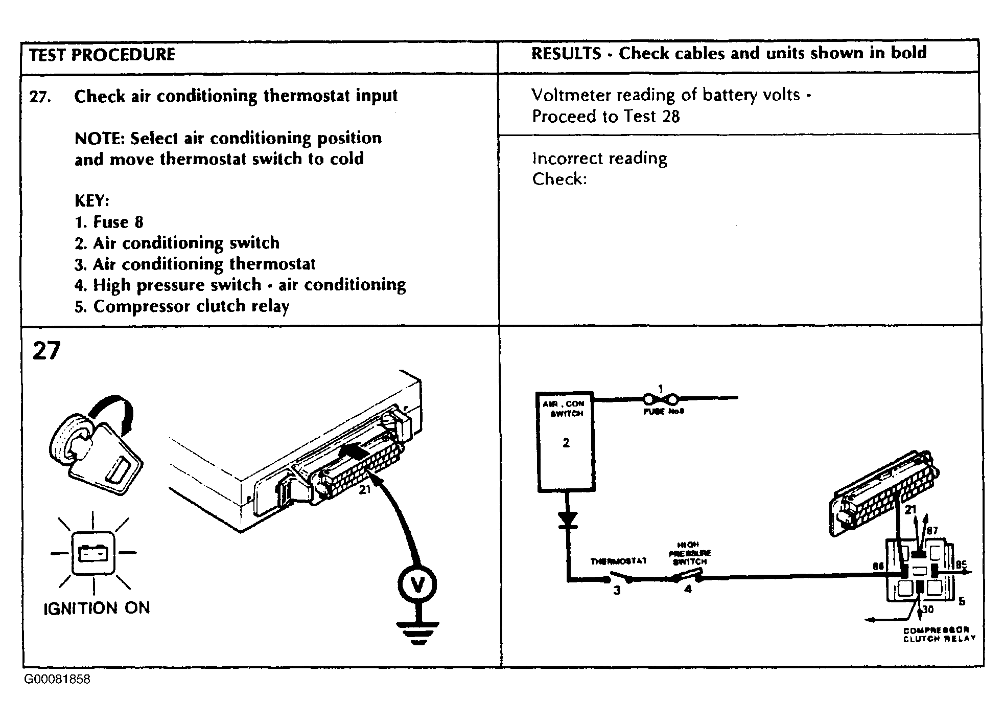 To test air conditioning thermostat input control, see Fig 1 . After completing the tests, retest the vehicle to ensure the faults have been rectified. If faults still persist, recheck using Lucas diagnostic equipment.