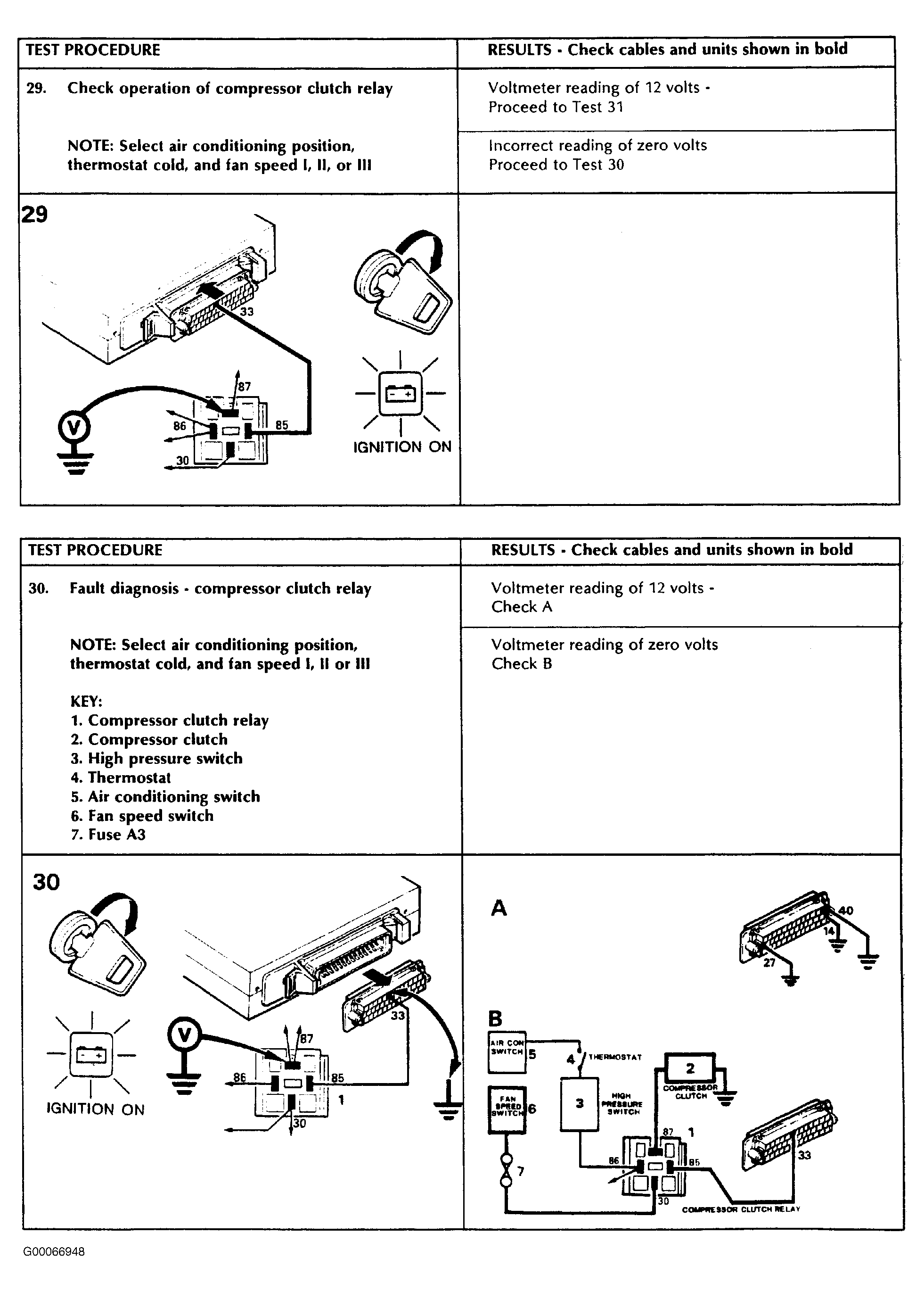 To test A/C clutch relay, see Fig 1 . After completing the tests, retest the vehicle to ensure the faults have been rectified. If faults still persist, recheck using Lucas diagnostic equipment.