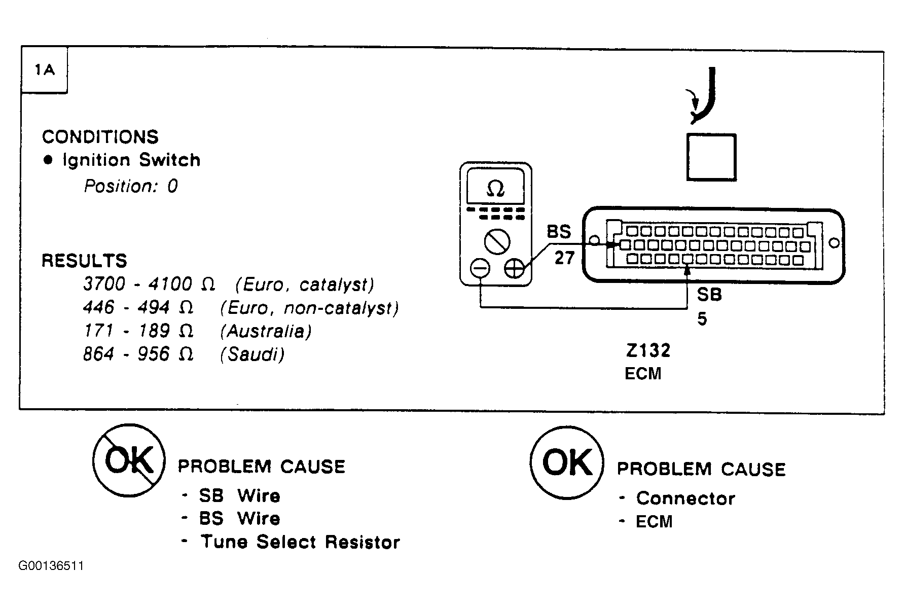 To suit individual market requirements, a tune select resistor is connected across terminals No. 5 & 27 of Engine Control Module (ECM). Tune select resistor is located adjacent to ECM, and strapped to EFI cable assembly. Value of resistor is dependent on market application. For USA models, resistor value is 3900 ohms, with White wire. Code 21 identifies that the tune select resistor is open circuit. To test tune select resistor, see Fig 1 . After completing the tests, retest the vehicle to ensure the faults have been rectified. If faults still persist, recheck using Lucas diagnostic equipment.