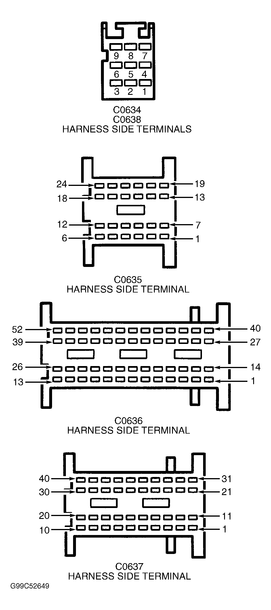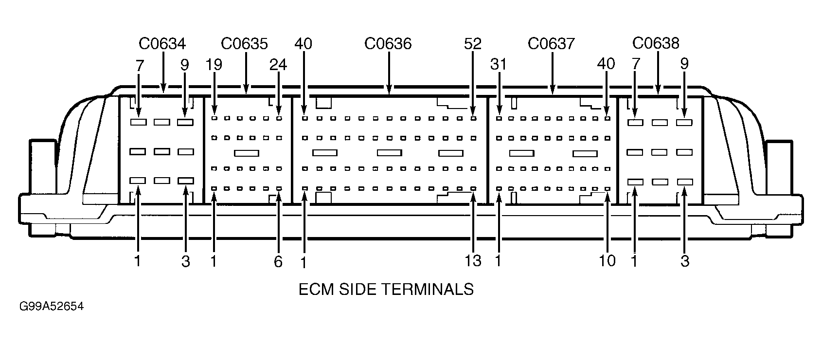 - Turn ignition off. Using a backprobe set, check for voltage between ground and ECM Black 9-pin connector C0634 terminal No. 7 (Purple/Yellow wire). If battery voltage is present, go to next step. If battery voltage is not present, check for open or short in Purple/Yellow wire between ECM and fuse No. 12 (20-amp) located in engine compartment fuse/relay box. See Figure and Figure . See WIRING DIAGRAMS . Perform repairs as necessary.
