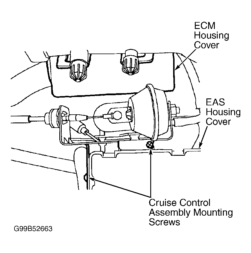 Remove battery cover and disconnect negative battery cable. Position cruise control actuator and pump assembly aside. Lift 2 plastic clips at the top of the "E" box and pull "E" box lid upward and out. See Fig 1. Release ECM housing cover. Disconnect ECM cooling fan connector. Remove ECM from housing cover. ECM is held in position in the lid of the box by 2 plastic brackets. Release plastic brackets and remove ECM. To install, reverse removal procedure.