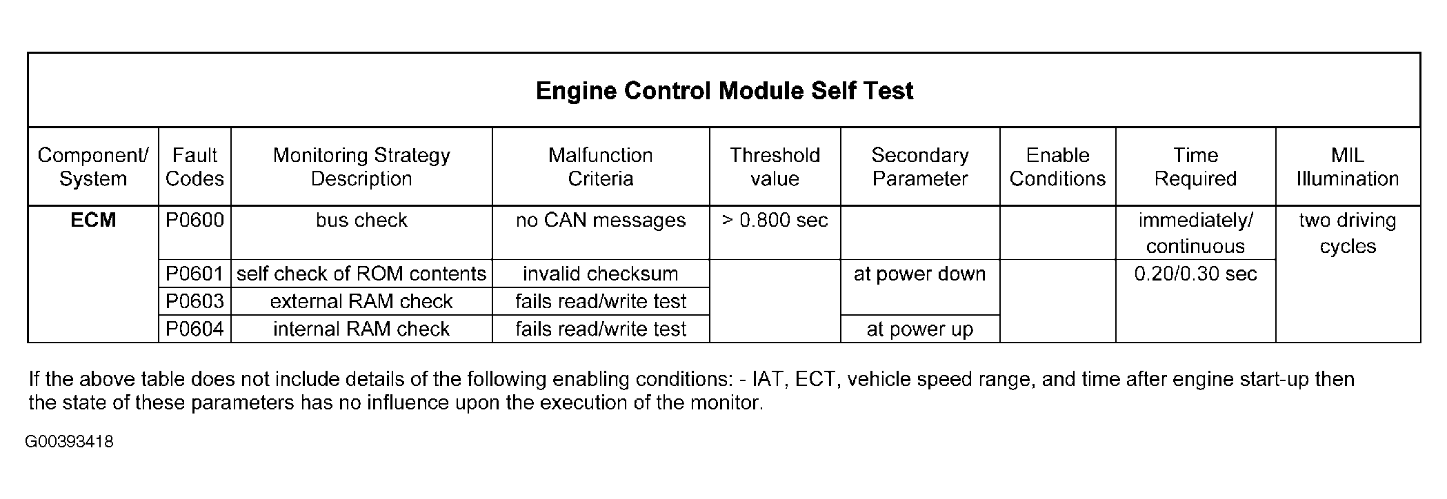 The ECM performs a number of self-test integrity diagnostics on its internal hardware and software to check for faults. An error is detected if the ECM receives no CAN messages for at least 0.8 seconds, the calculated checksums at power down do not match the values stored in flash Electrically Erasable Programmable Read Only Memory (EEPROM) or the internal or external RAM fails a read/write test. For engine control module self test testing, see Fig 1 .