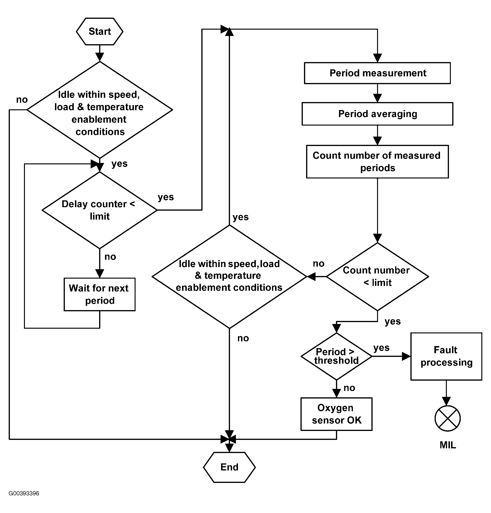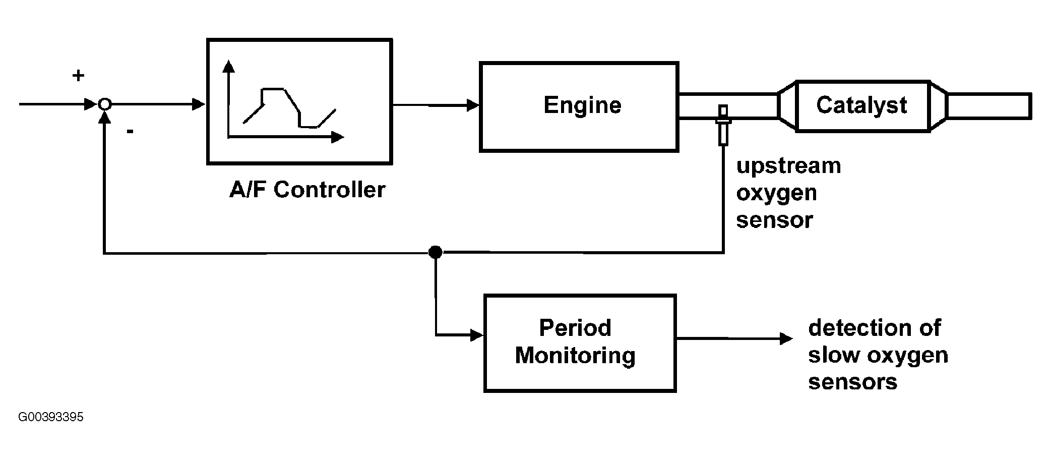 The response rates of the upstream O2 sensors are monitored by measuring the period of the Lambda control oscillations. This period monitoring allows the detection of a slow O2 sensor. See Fig 1 and Fig 2 .