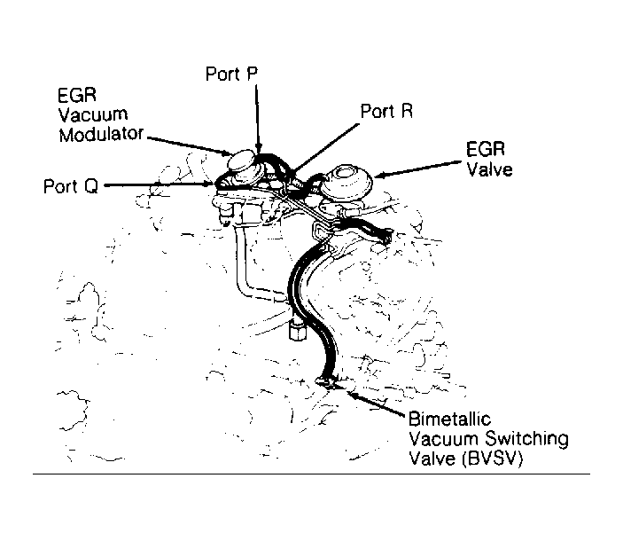 7. Start engine and run engine at 3500 RPM. Block ports "P" and "R" with finger. Blow air into port "Q". Air should not flow out of filter. If air flows out of filter, replace EGR vacuum modulator.