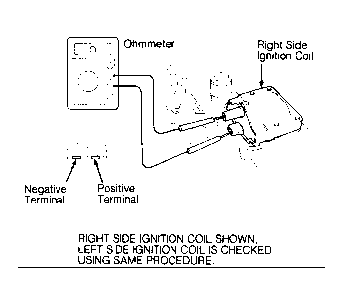 Turn ignition off. Disconnect wires from ignition coil. See Fig 1. Using an ohmmeter, check primary coil resistance on ignition coil. For resistance specifications, see IGNITION COIL RESISTANCE  table.
