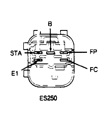 2. Apply battery voltage between terminals STA and E1 on ES250 or ST and E1 on LS400. Using an ohmmeter, ensure continuity is present between terminals B and FP. Apply battery voltage between terminals B and FC on ES250 or IG and FC on LS400. Ensure continuity is present between terminals B and FP. If continuity is not as specified, replace relay.