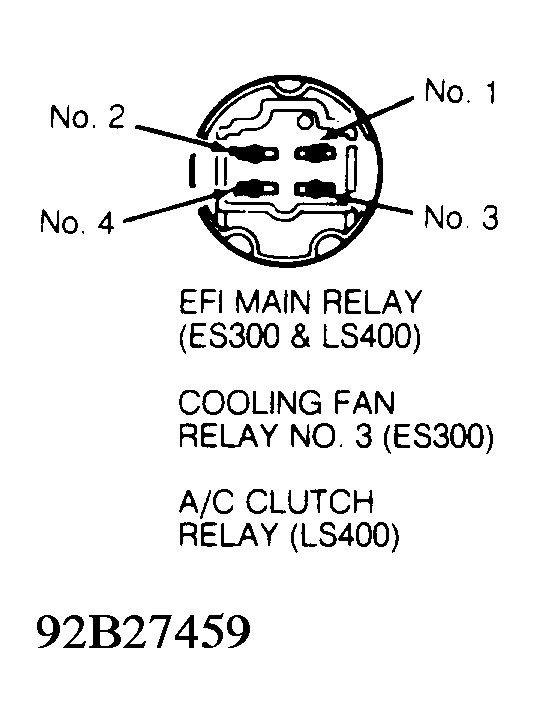 - EFI main relay is located in engine compartment. Using an ohmmeter, check for continuity between relay terminals No. 1 and 3. Ensure continuity is not present between terminals No. 2 and 4. If continuity is not as specified, replace relay. See Fig 1.