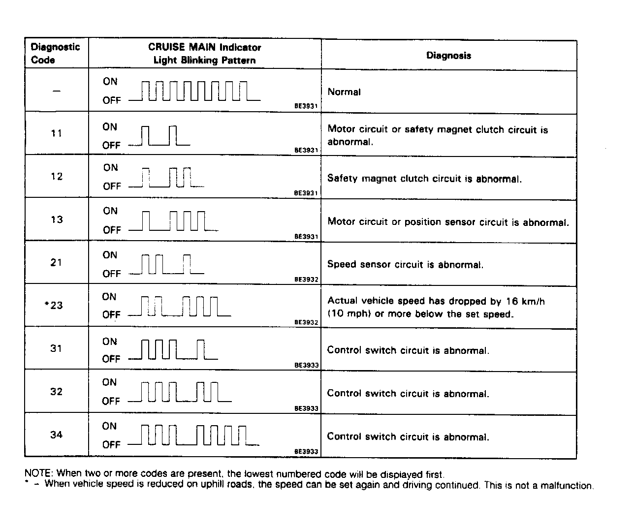 - Read diagnostic code on CRUISE MAIN indicator light. See Figure. If a diagnostic code is not displayed, inspect diagnostic circuit. See DIAGNOSTIC (TC) CIRCUIT under TESTING. If a diagnostic code is displayed, perform procedure indicated by the diagnostic codes chart. See Figure. See TESTING .
