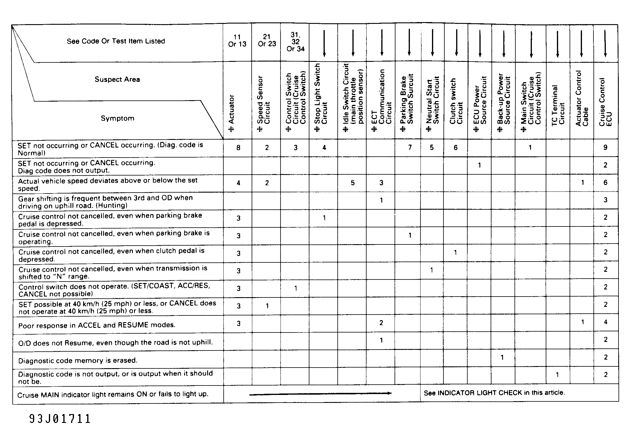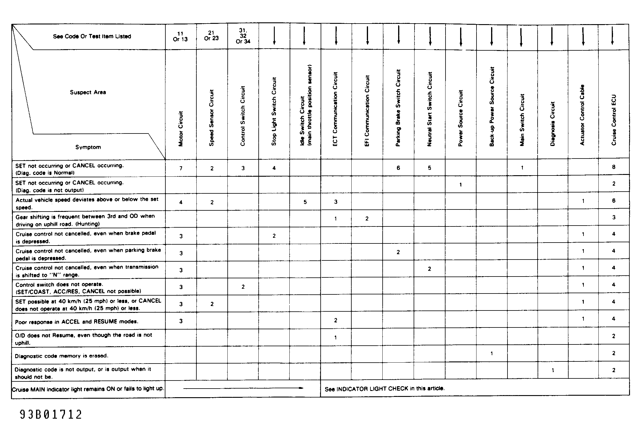1. Perform INPUT SIGNAL CHECK  under TROUBLE SHOOTING. Check cruise control indicator light while driving vehicle at speeds greater than and less than 25 MPH (40 Km/h).