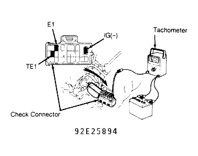 - Connect spark plug and coil wires to distributor cap. Start engine, and warm it to normal operating temperature. Connect test probe of tachometer to terminal IG (-) of check connector. See Fig 2.CAUTION: Never allow tachometer terminal to touch ground as it can cause damage to ignitor and/or ignition coil. Some tachometers are not compatible with ignition system. Confirm compatibility before using tachometer.