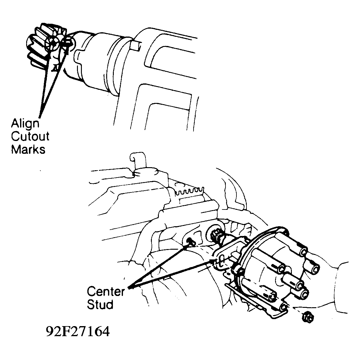 - Install new "O" ring seal to distributor shaft and coat with oil. Align protrusion on drive gear with groove in distributor housing. Insert distributor, aligning stud in cylinder head with center of flange slot. See Fig 1. Lightly tighten hold-down nut.