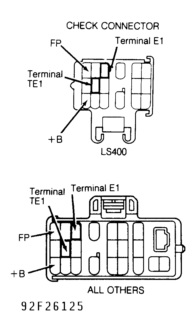 1. Check fuel pressure. Ensure a sufficient amount of fuel is in fuel tank. Turn ignition off. Locate check connector in engine compartment. Using a jumper wire, connect check connector terminals +B and FP. See Fig 1. Turn ignition on.