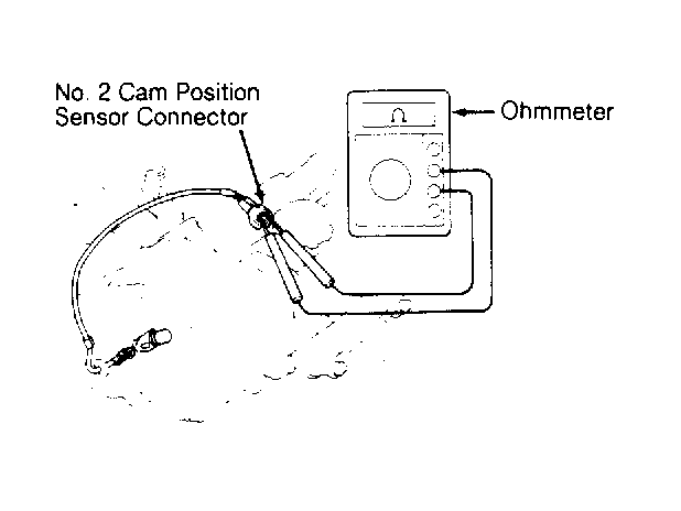 - Using an ohmmeter, measure resistance of No. 2 cam position sensor. See Fig 4. See DISTRIBUTOR SENSOR RESISTANCE table. If No. 2 cam position sensor resistance is not to specification, replace sensor. If resistance is within specification, go to next step.