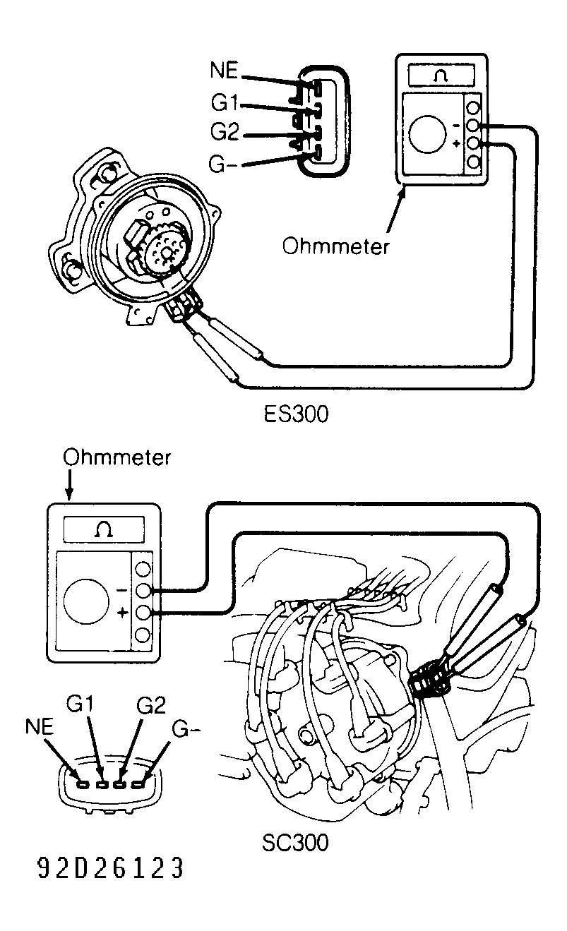 Application Primary Secondary ES300 .30-.60 9000-15,000 LS400 & SC400 .40-.50 10,200-13,800 SC300 .20-.30 6000-11,000 - On ES300 and SC300, measure resistance of pick-up coil. See Fig 1. See DISTRIBUTOR SENSOR RESISTANCE table. If resistance is not within specification, replace distributor housing assembly.