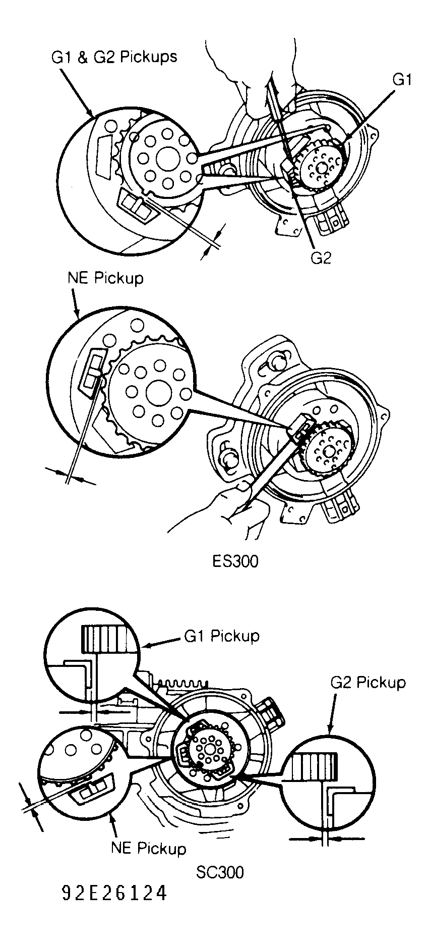 - Check air gap in distributor. Measure air gap of G1 pick-up, G2 pick-up and NE pick-up. See Fig 2. Air gap specification for ES300 is .008-.020" (.2-.5 mm). Air gap specification for SC300 is .008-.016" (.2-.4 mm). If air gap is not to specification, replace distributor.