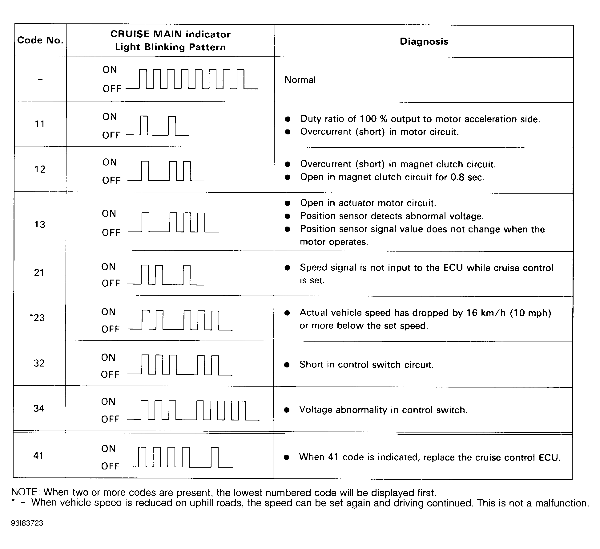 - Read diagnostic code on CRUISE MAIN indicator light. See Figure. If a diagnostic code is not displayed, inspect diagnostic circuit. See DIAGNOSTIC (TC) CIRCUIT under TESTING. If a diagnostic code is displayed, perform procedure indicated by the diagnostic codes chart. See TESTING .