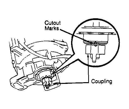 1. Ensure No. 1 piston is still at TDC of compression stroke. Install new "O" ring onto distributor housing. Lightly coat "O" ring with oil. Align cut-out marks of distributor coupling and housing. See Fig 1. Install distributor, and lightly tighten hold-down bolts.