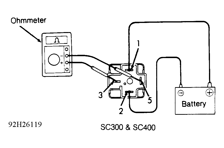 4. On ES300, GS300, and LS400, apply battery voltage between relay terminals No. 1 and 3. Using an ohmmeter, check for continuity between relay terminals No. 2 and 4. On SC300 and SC400, apply battery voltage between terminals No. 1 and 2. Using an ohmmeter, check for continuity between relay terminals No. 3 and 5. If continuity is not present, replace relay.