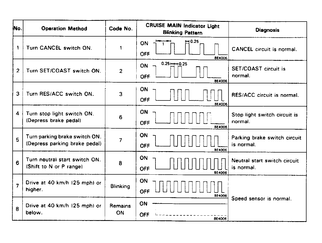 Operate appropriate switch (or simulate driving if checking speed sensor). See Figure. If cruise indicator light does not respond as specified, cruise control ECU is not receiving input signal due to a faulty circuit.