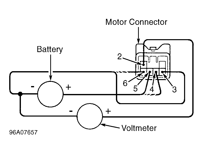 - Connect battery voltage between terminals No. 6 (positive lead) and No. 5 (negative lead) at motor connector. See Fig 2. Connect voltmeter between ground and terminal No. 2 of motor connector. While watching voltmeter, connect battery voltage between terminals No. 3 (positive lead) and No. 4 (negative lead) at motor connector. Go to next step.