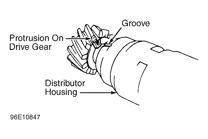 - Install NEW "O" ring on distributor housing. Coat "O" ring with engine oil. Align protrusion on drive gear with groove on distributor housing. See Fig 3.