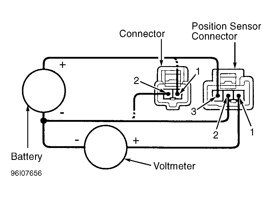- If testing any sensor, connect battery voltage between terminals No. 3 (positive lead) and No. 2 (negative lead) at position sensor connector. See Fig 1. Connect voltmeter between ground and terminal No. 1 of position sensor connector. While watching voltmeter, connect battery voltage between terminals No. 2 (positive lead) and No. 1 (negative lead) at motor connector. Go to step 9).