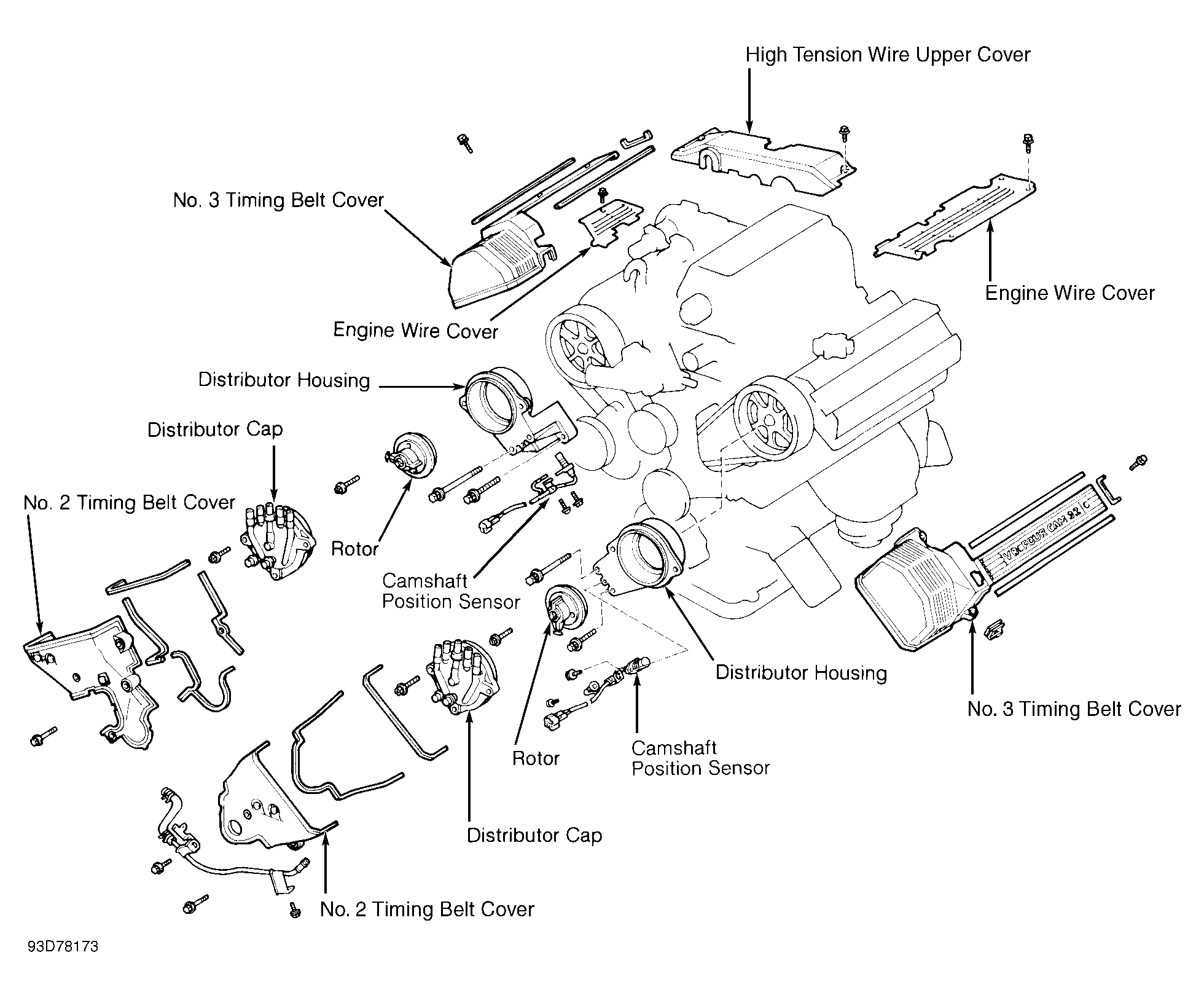 - Disconnect camshaft position sensor connector. Remove wire boot and No. 2 timing belt cover with 4 gaskets. See Figure. Disconnect high tension wires from distributor cap. Remove distributor cap. Remove rotor. Remove distributor. Camshaft position sensor can be removed at this time.