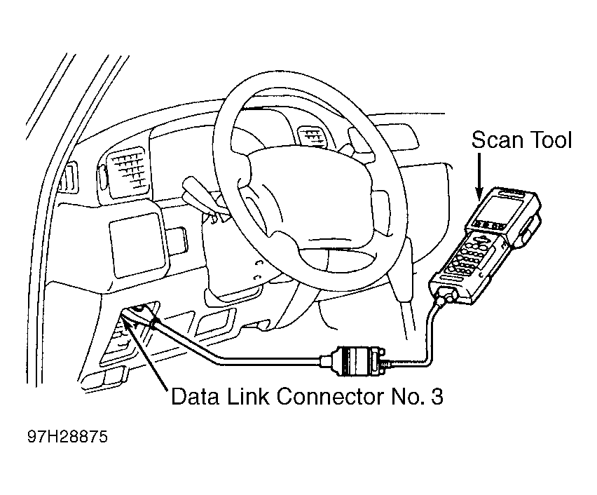 1. Remove cover (if equipped) and connect scan tool to data link connector No. 3. See Fig 1. Turn ignition on. DO NOT start engine.