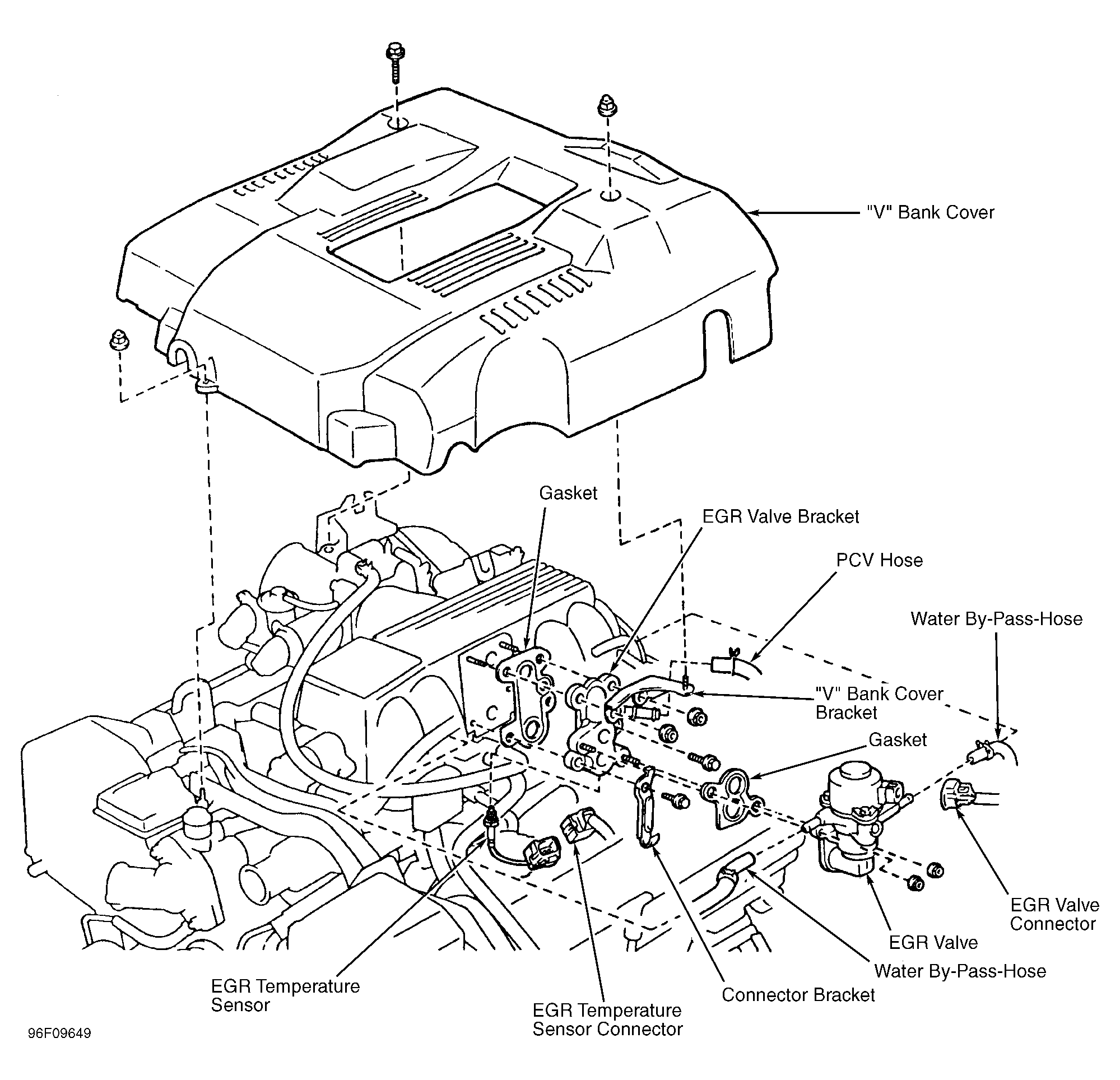 1. Remove "V" bank cover. See Figure. To remove left distributor, go to step 4). To remove right distributor, disconnect Idle Air Control (IAC) valve air hoses from No. 3 timing belt cover. See Figure.