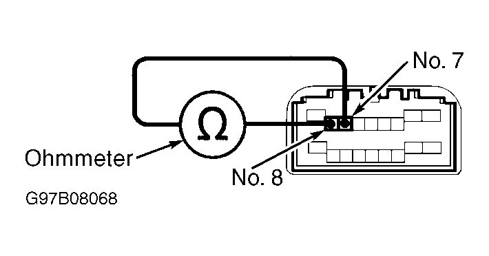 - Disconnect combination switch connector. On SC300 models, measure resistance between combination switch connector terminals No. 7 and No. 8. See Fig 1 and Fig 2