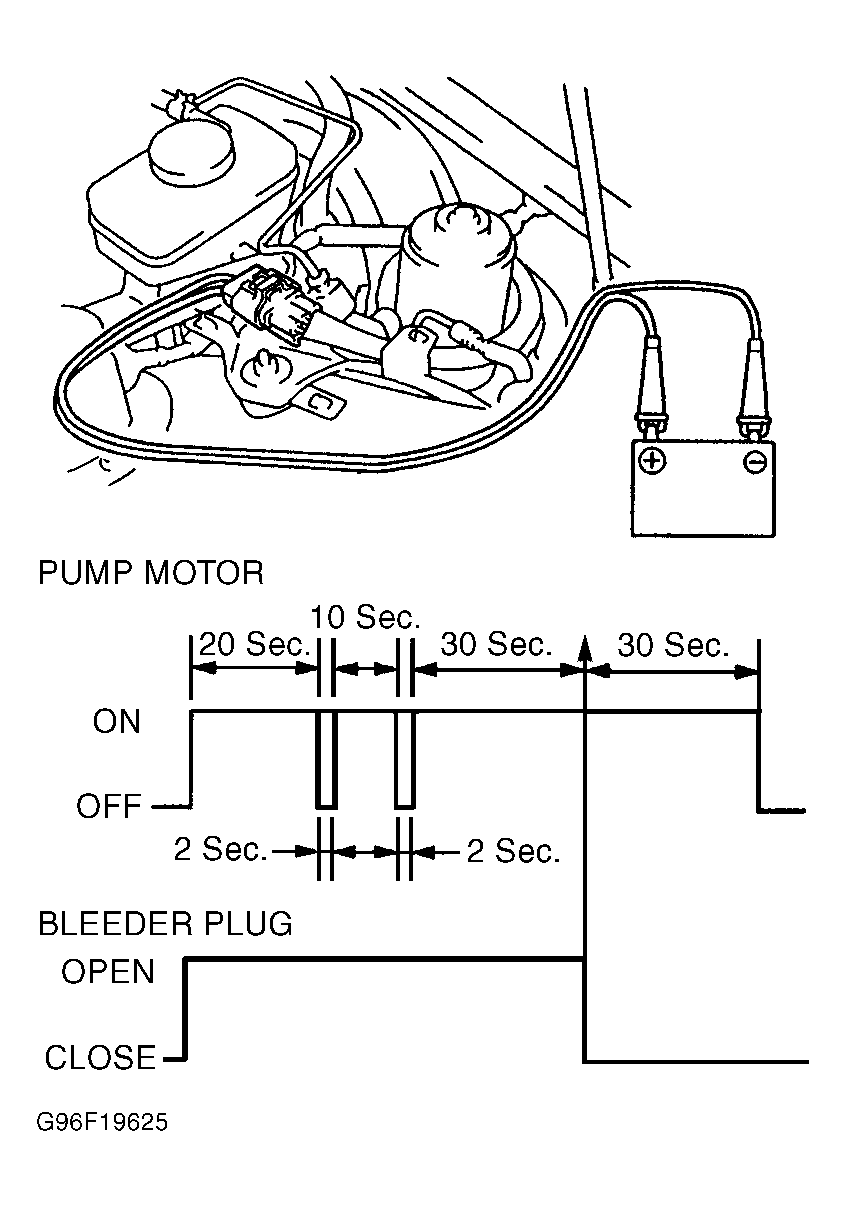 - Ensure master cylinder reservoir is full of brake fluid. Disconnect harness connector from pump. Connect auxiliary test harness to pump. See Fig 1. Remove battery cover and air cleaner inlet. Remove air cleaner assembly with hose.