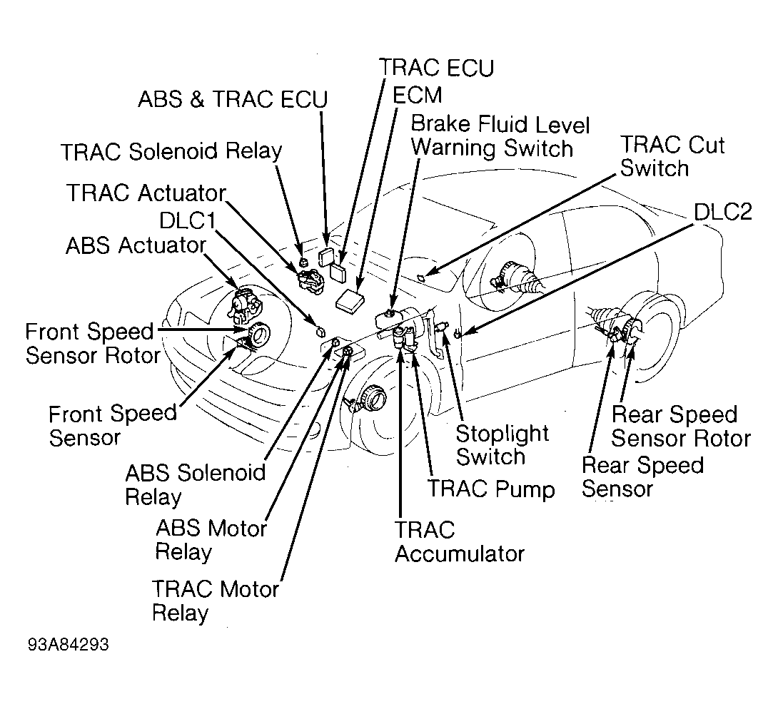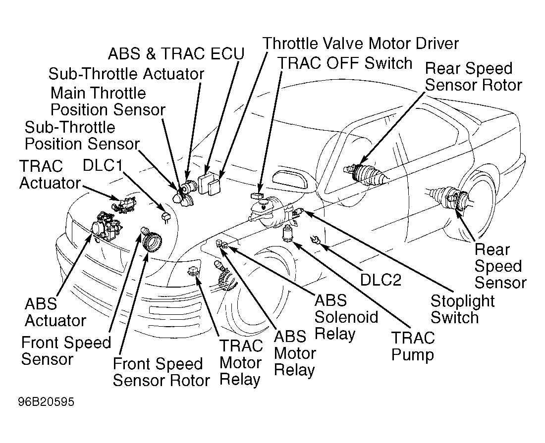 Lexus Traction Control System (TRAC) controls engine torque and braking of driving wheels. TRAC is available as an option. TRAC system consists of sub-throttle actuator, accumulator, pump, wheel speed sensors, ABS/TRAC ECU, TRAC ECU or throttle valve motor driver, relays, solenoids, motor relay, TRAC cut switch, light indicator and warning switch. See Fig 1, Fig 2 or Fig 3 .